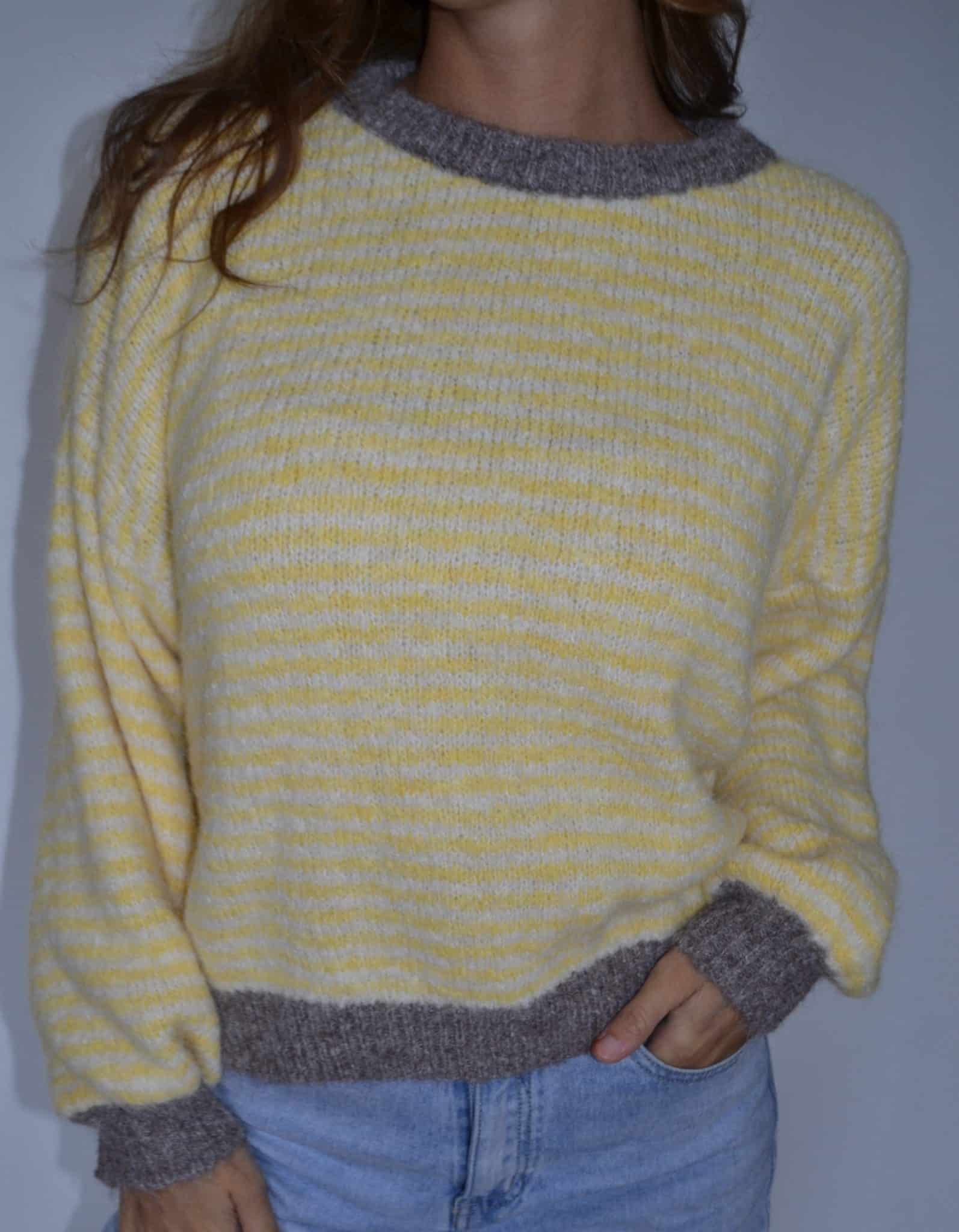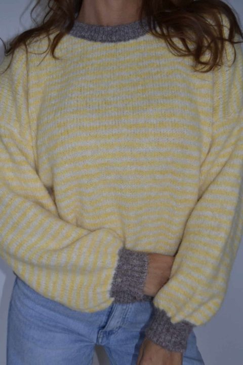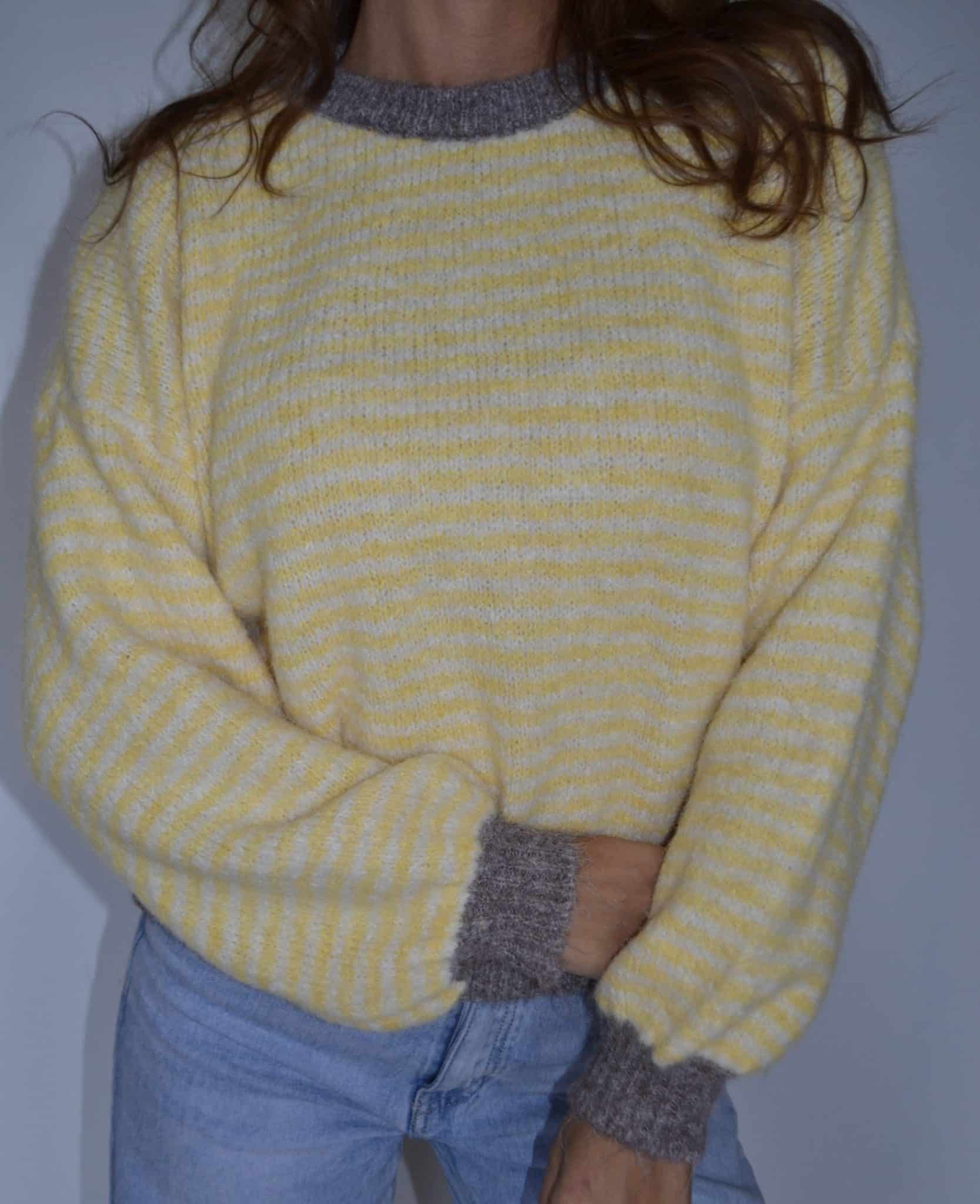 · Motif rayé bicolore sur l’ensemble du pull, apportant une touche moderne et lumineuse