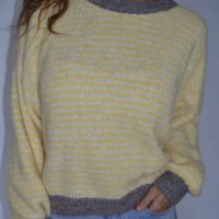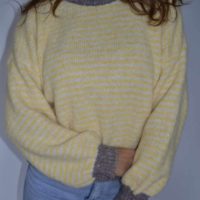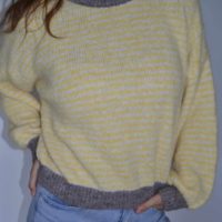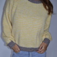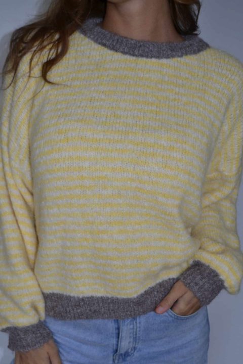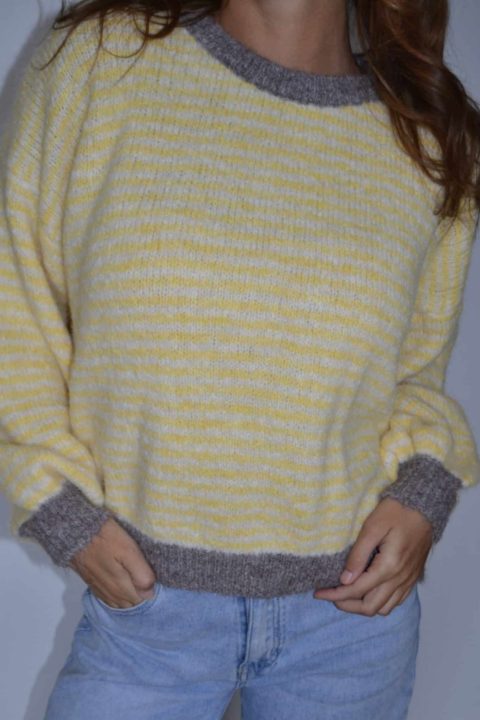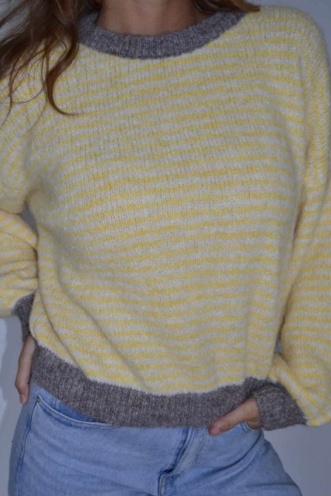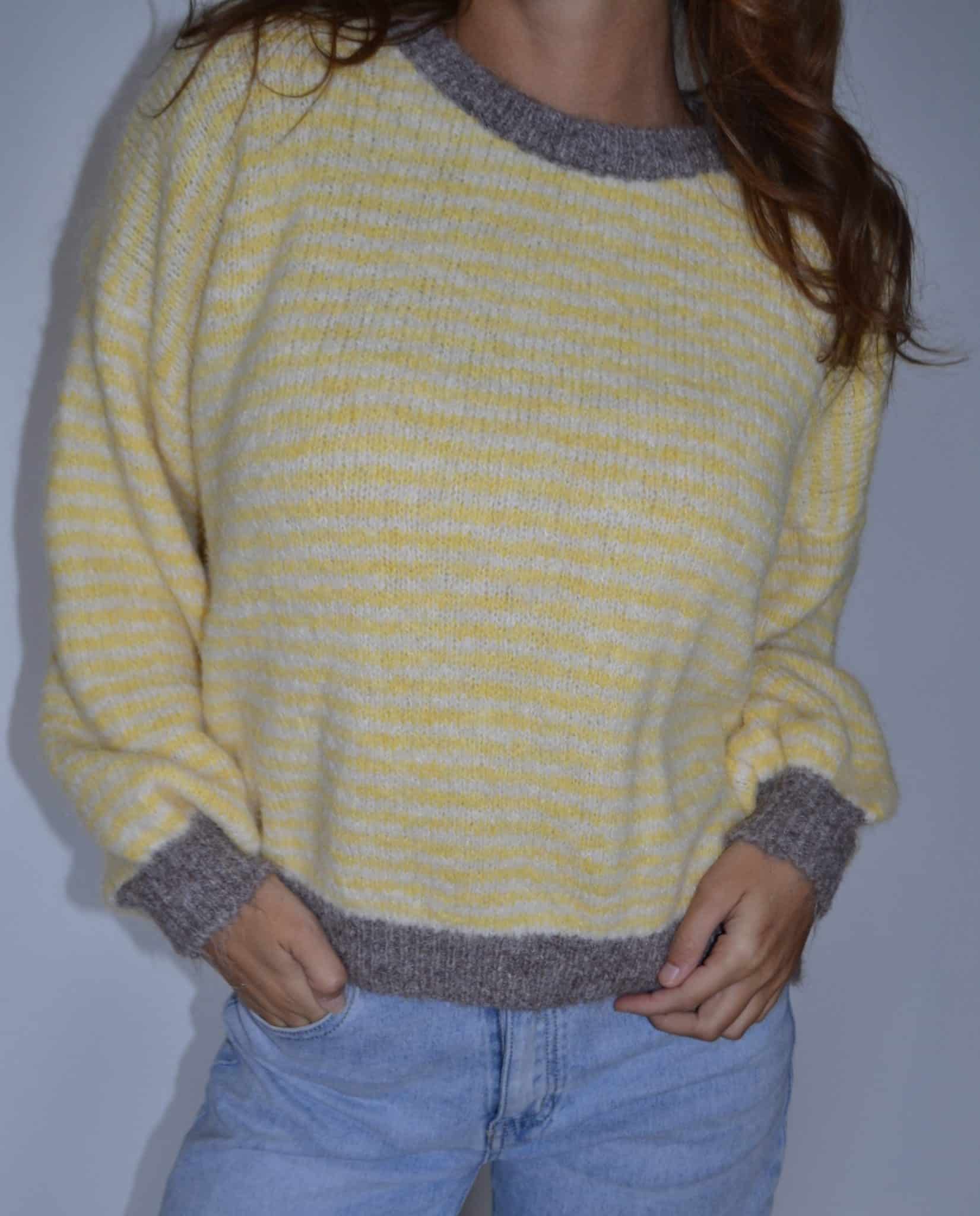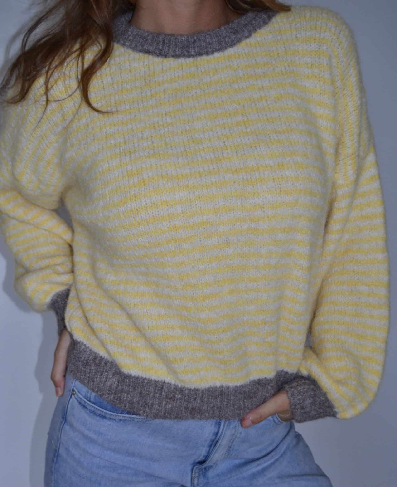 · Motif rayé bicolore sur l’ensemble du pull, apportant une touche moderne et lumineuse