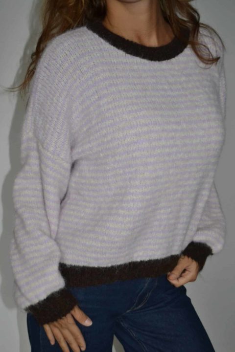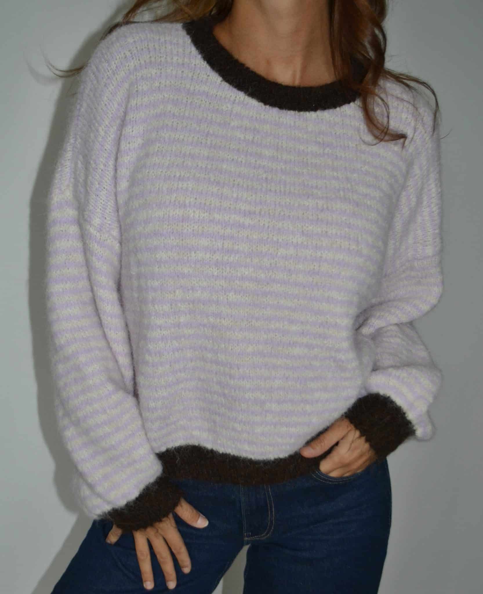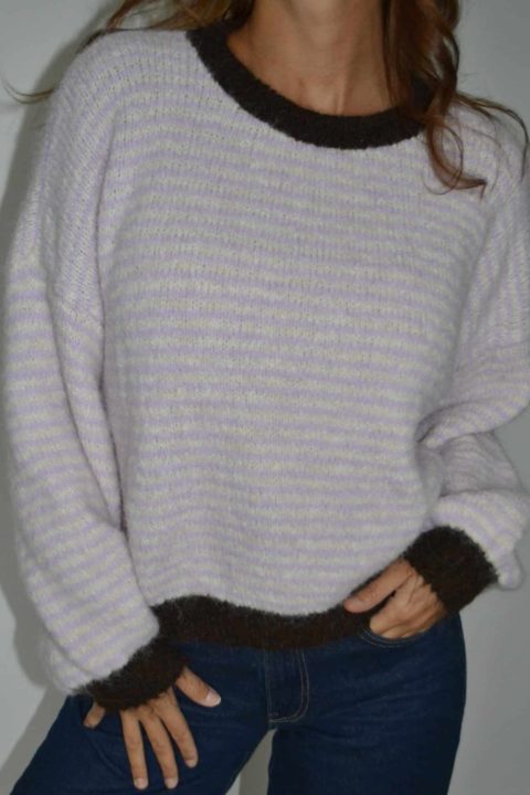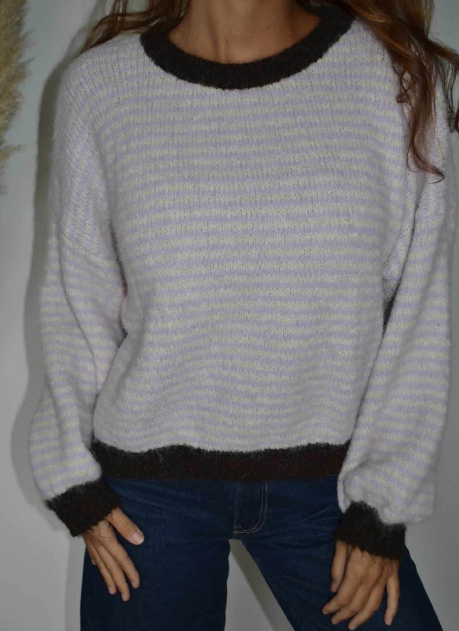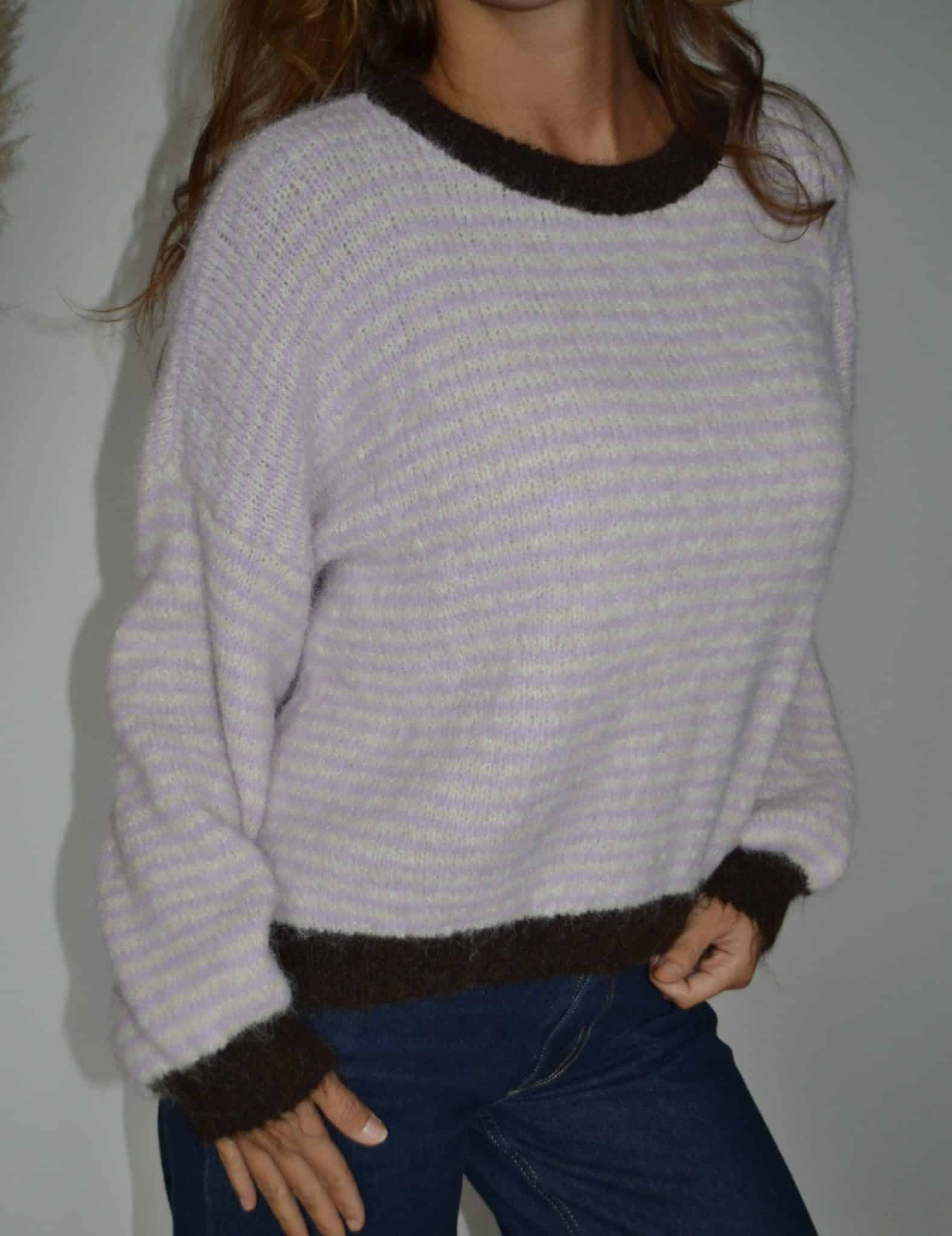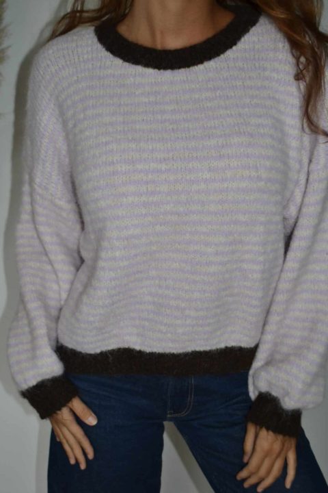 · Motif rayé bicolore sur l’ensemble du pull, apportant une touche moderne et lumineuse
