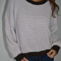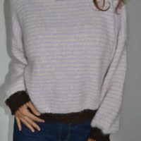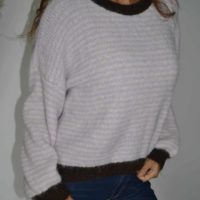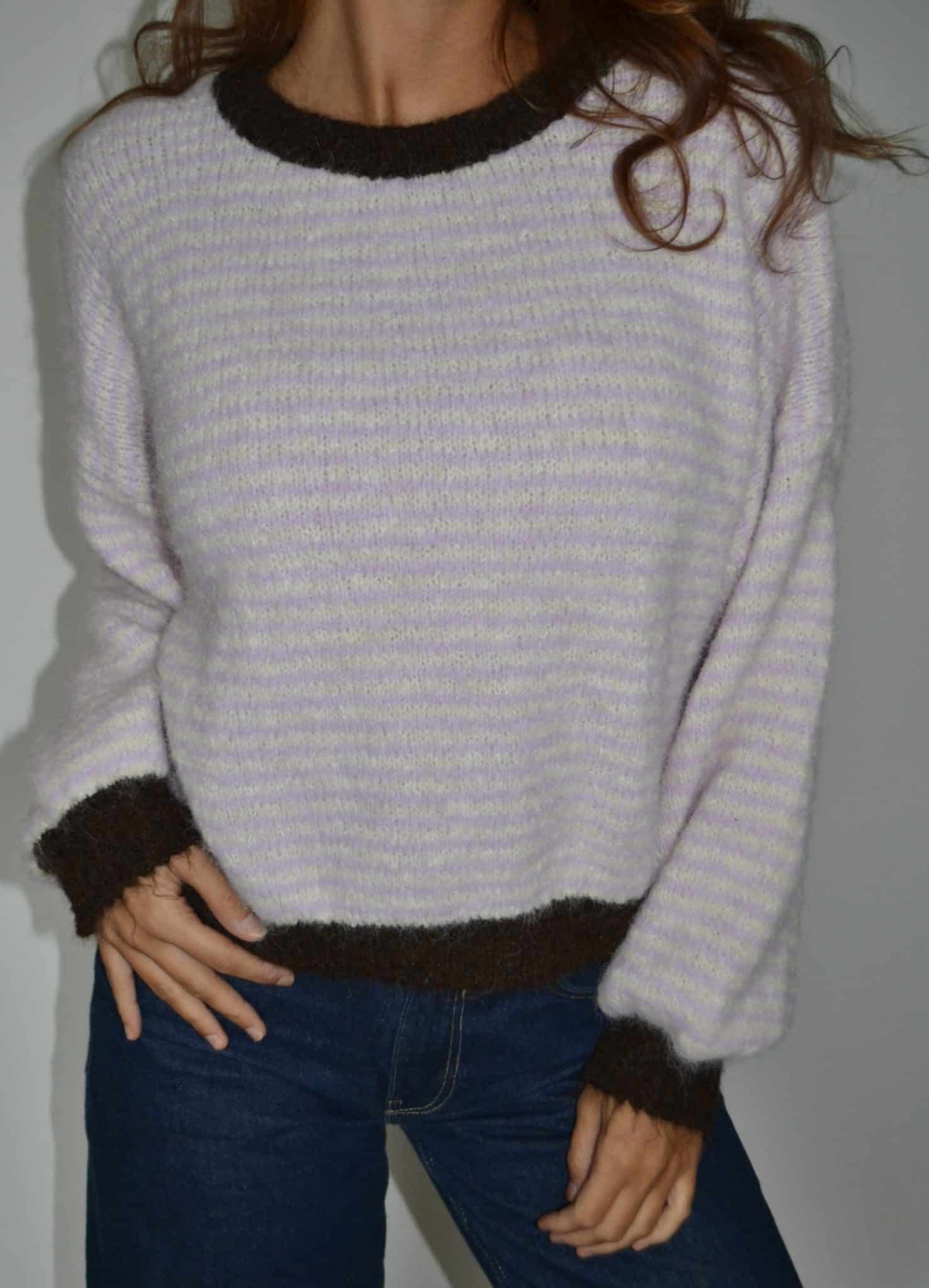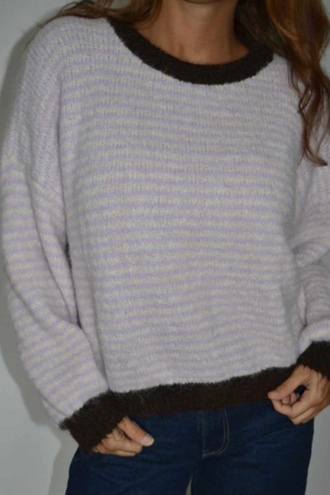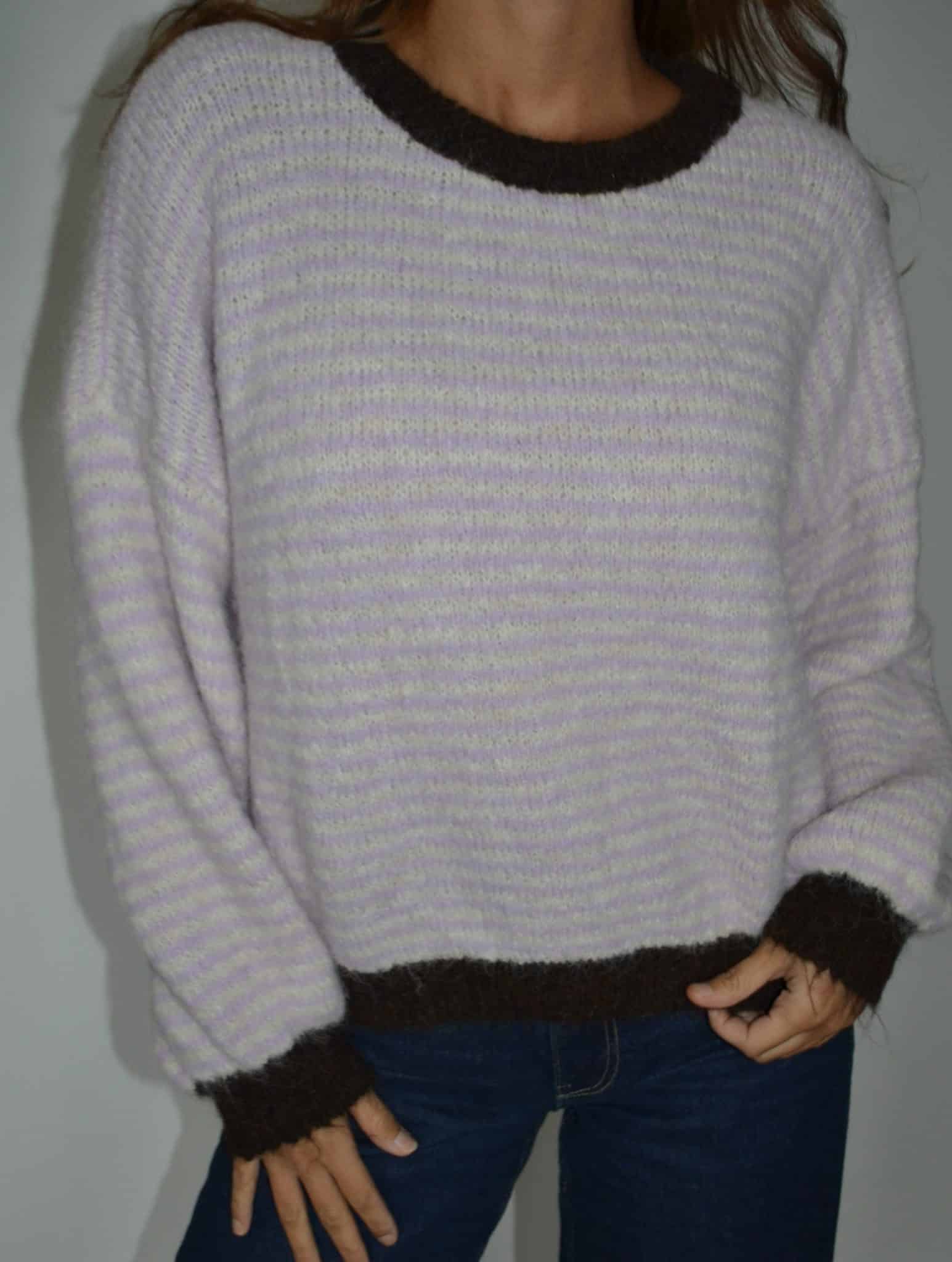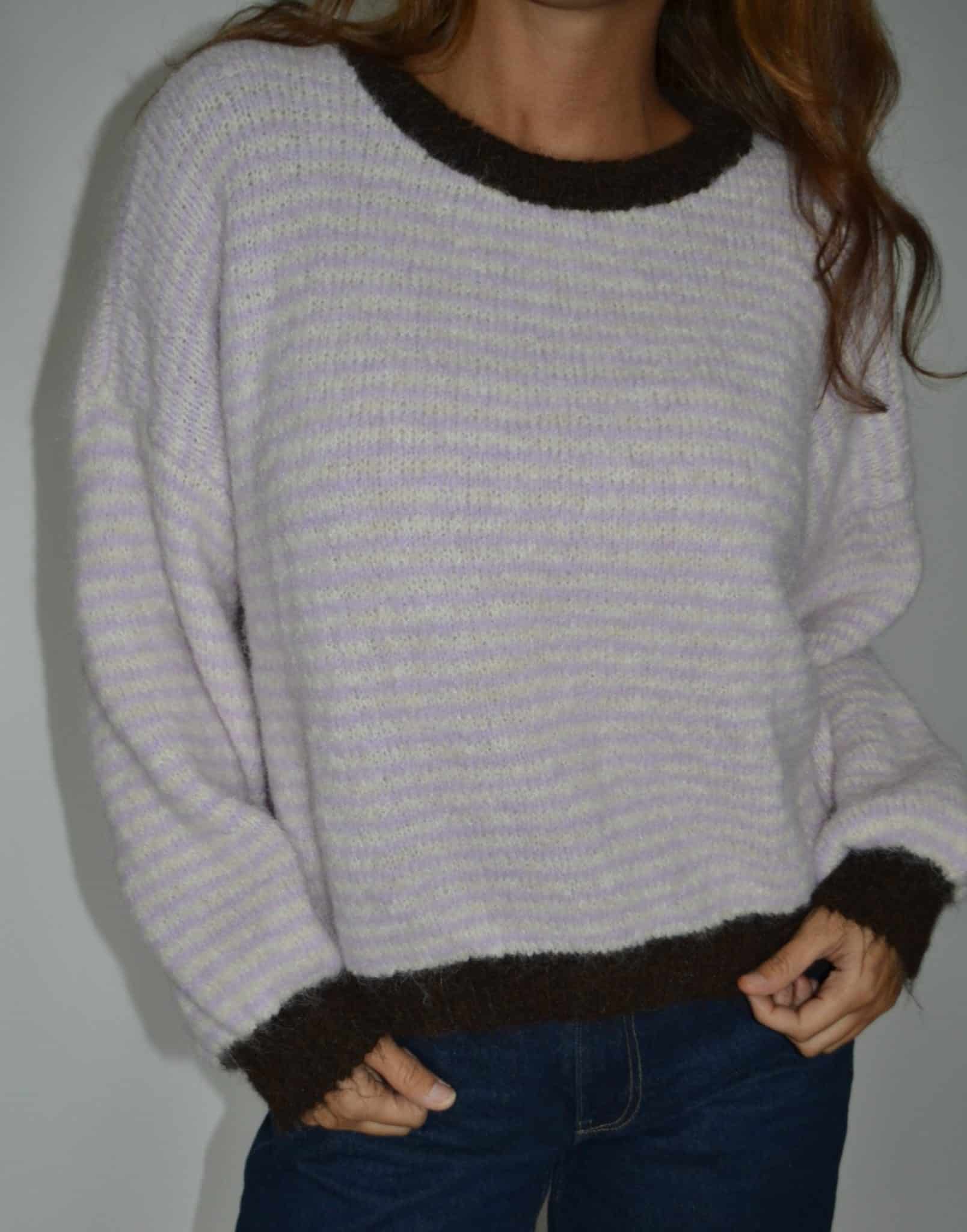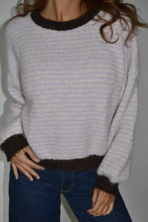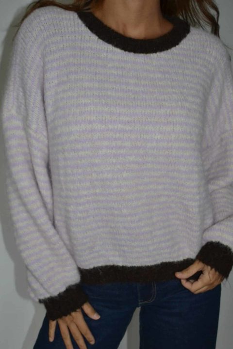 · Motif rayé bicolore sur l’ensemble du pull, apportant une touche moderne et lumineuse