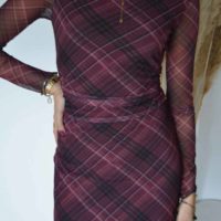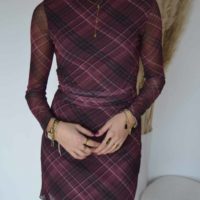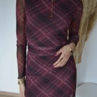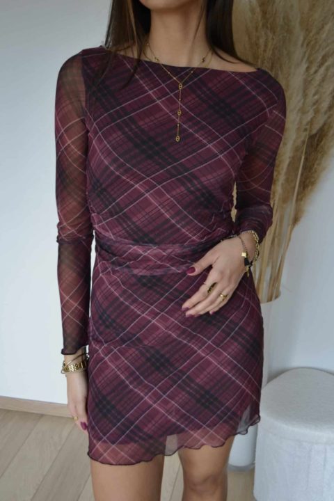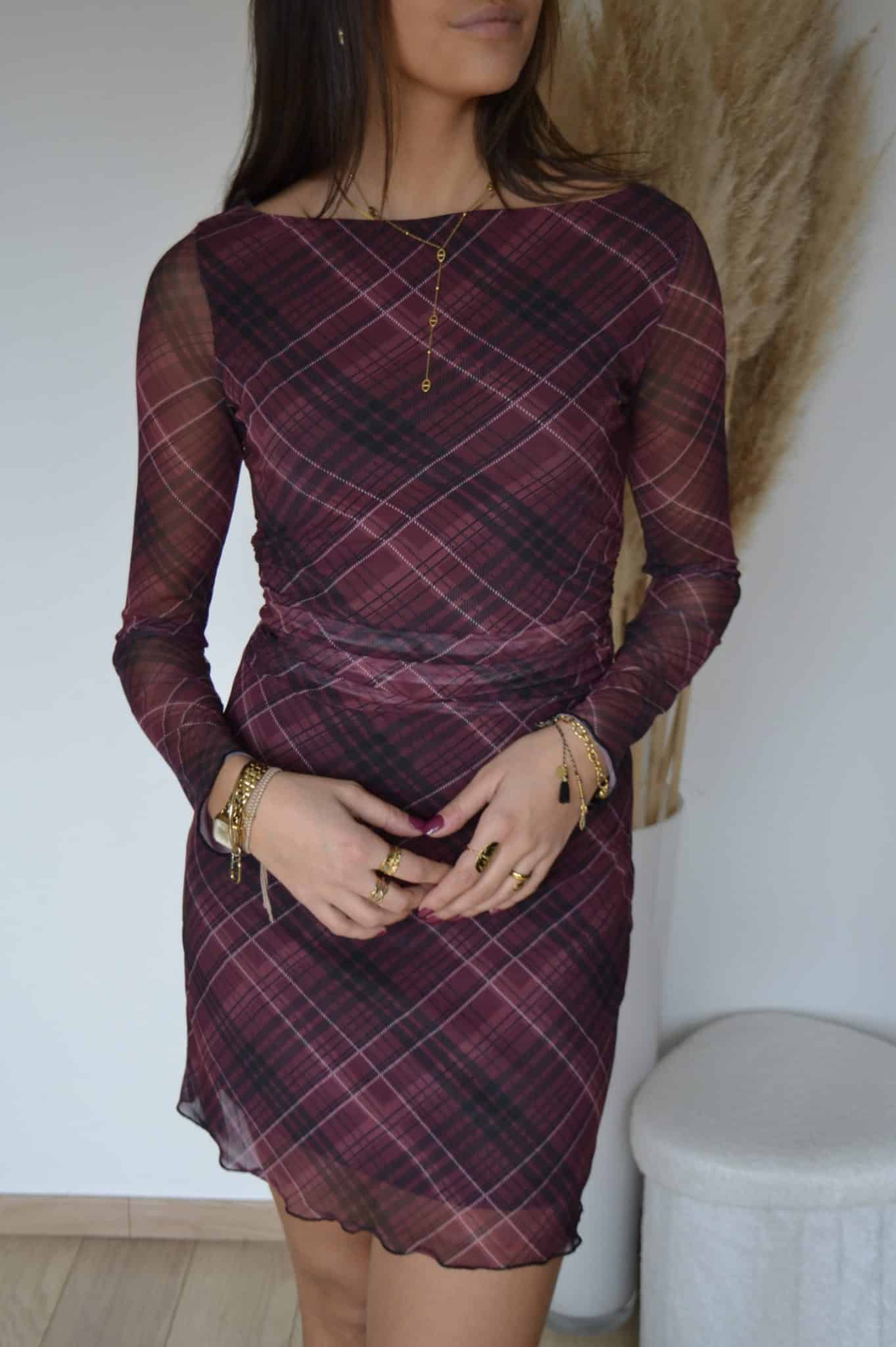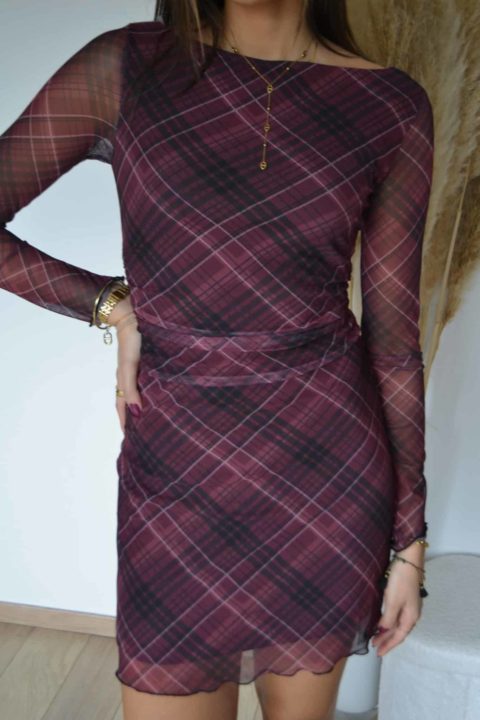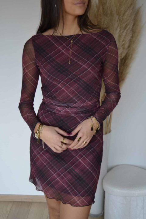 · Robe courte à manches longues, au motif à carreaux bordeaux, noir et blanc