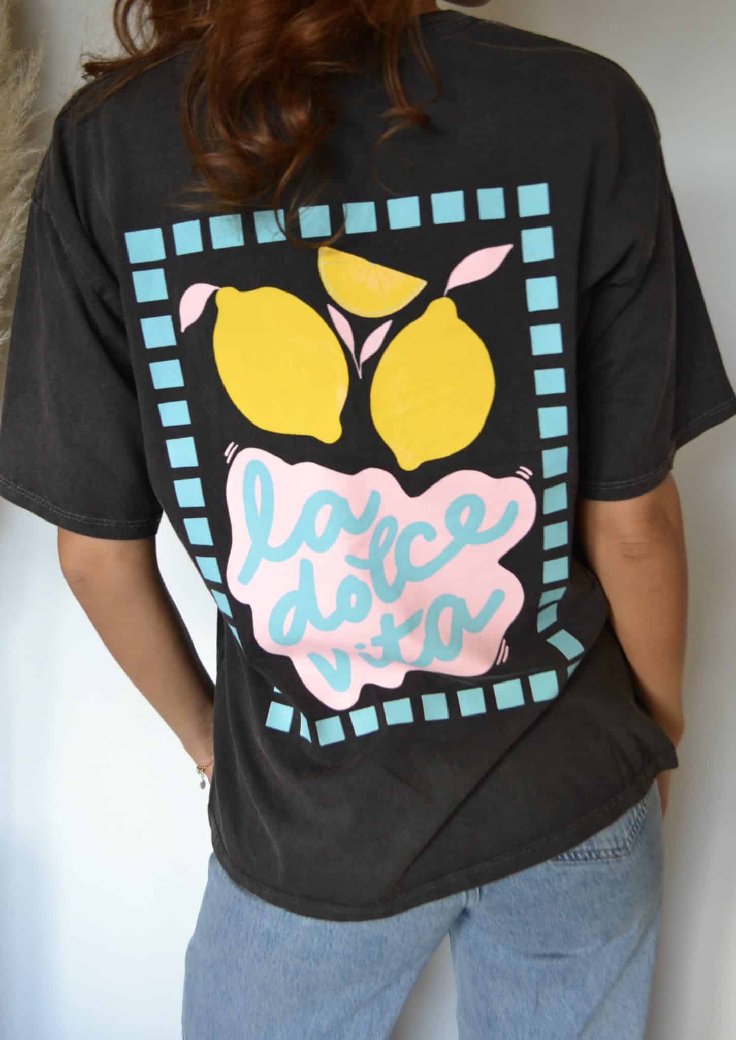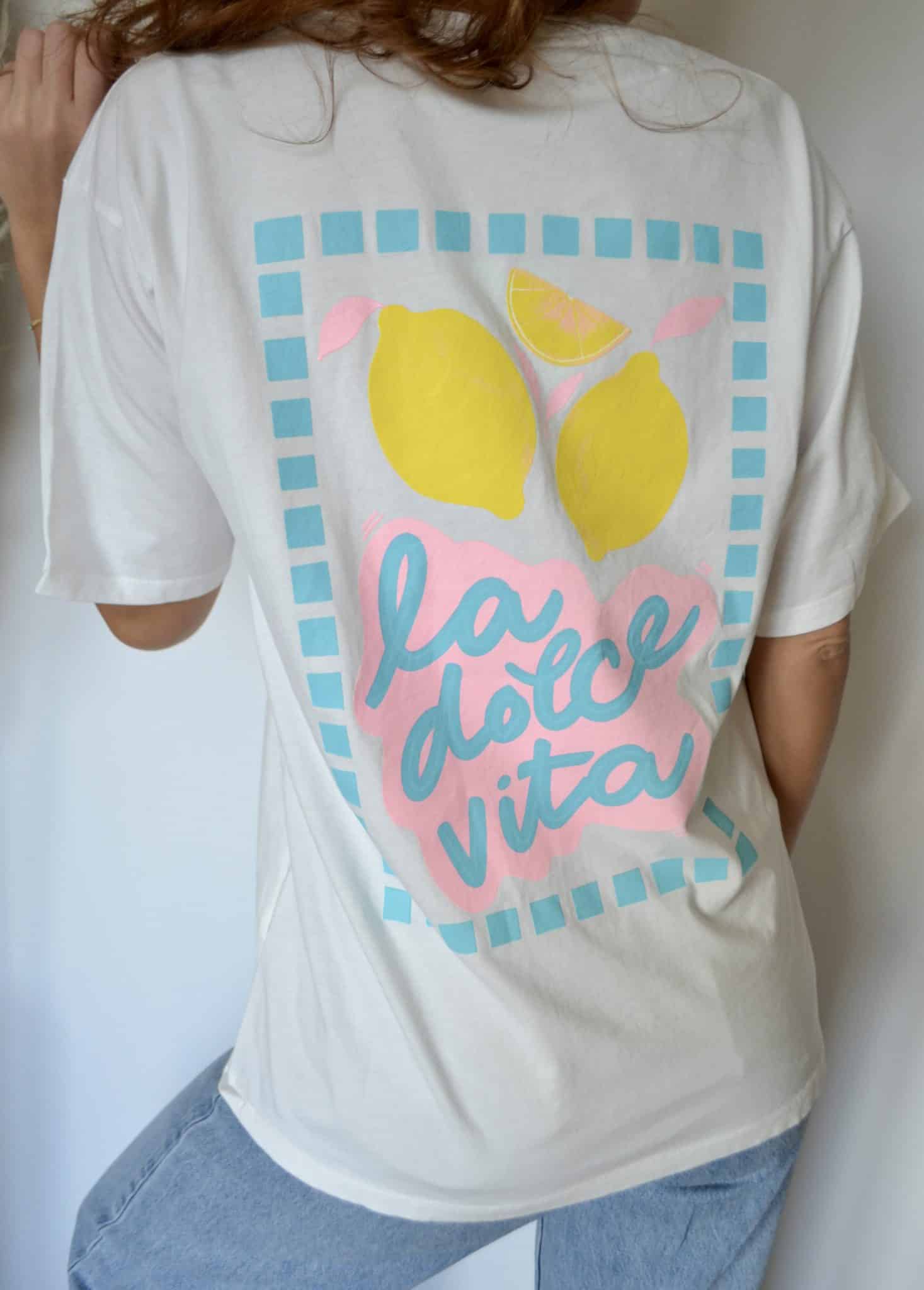 · Grand imprimé au dos avec citrons colorés et lettrage pastel