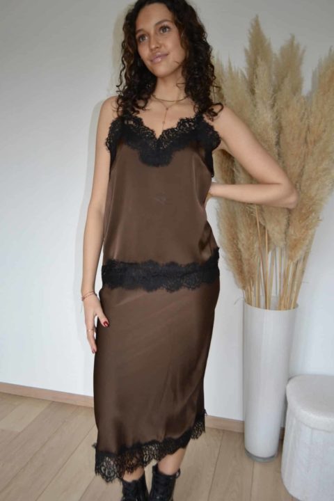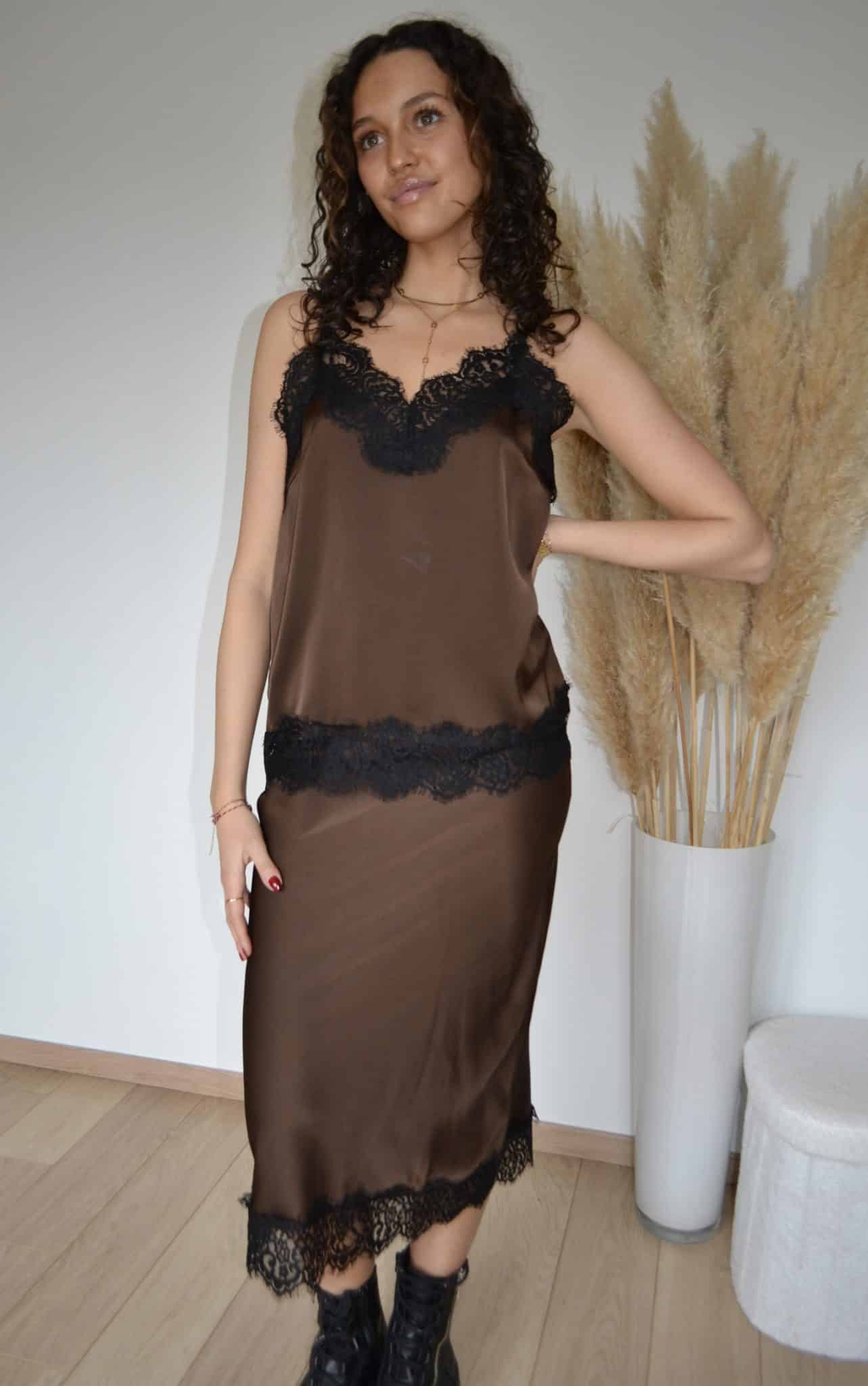 • Brun chocolat satiné avec dentelle noire