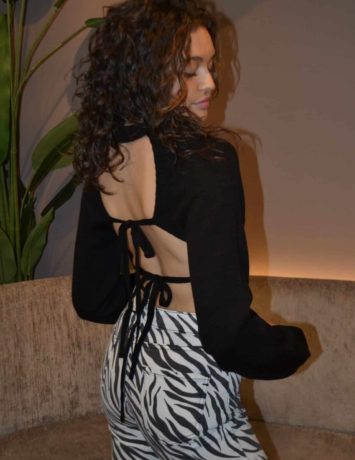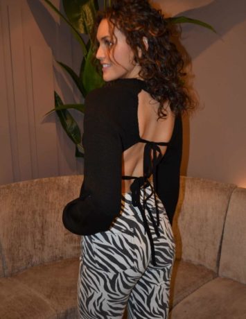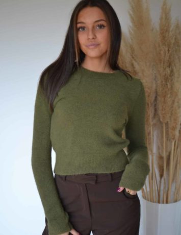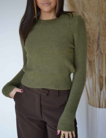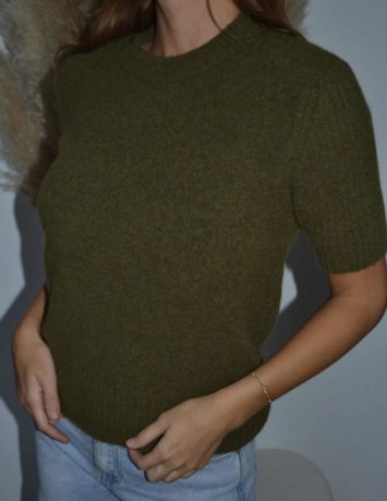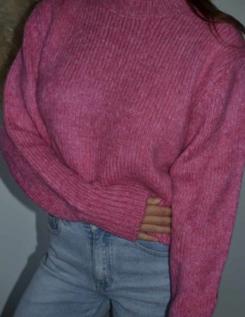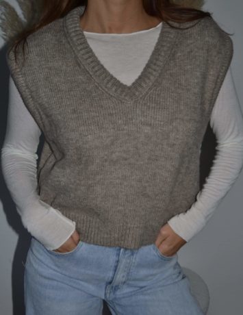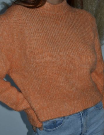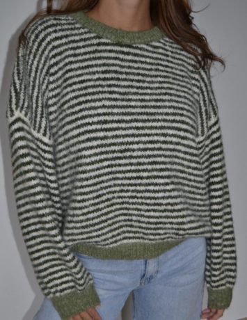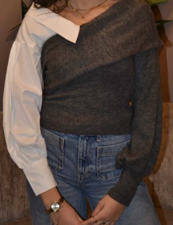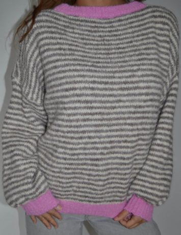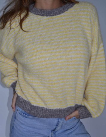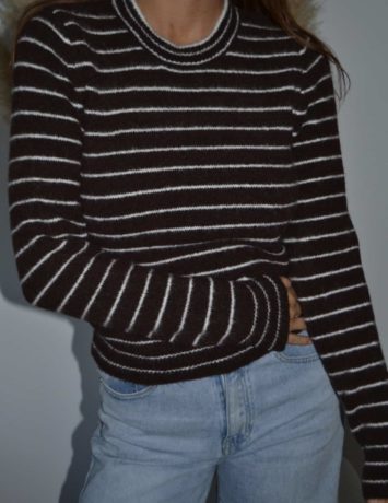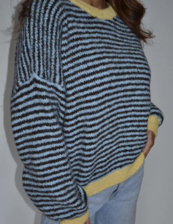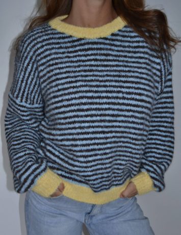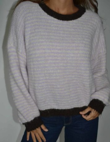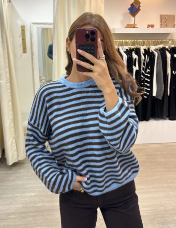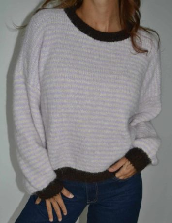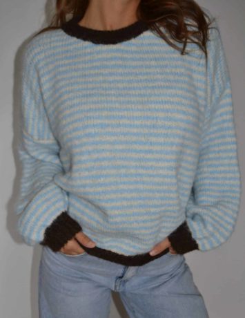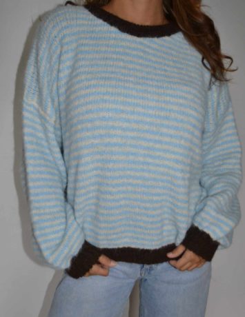 Pull en maille bleu ciel & blanc avec finitions chocolat