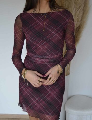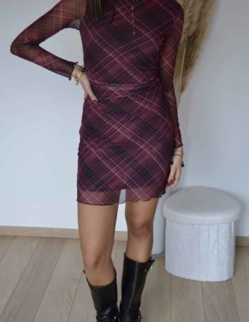 Robe courte à manches longues motif à carreaux